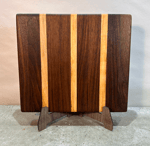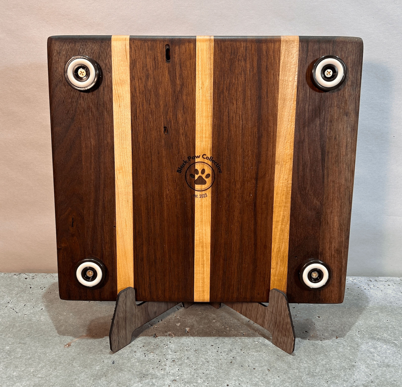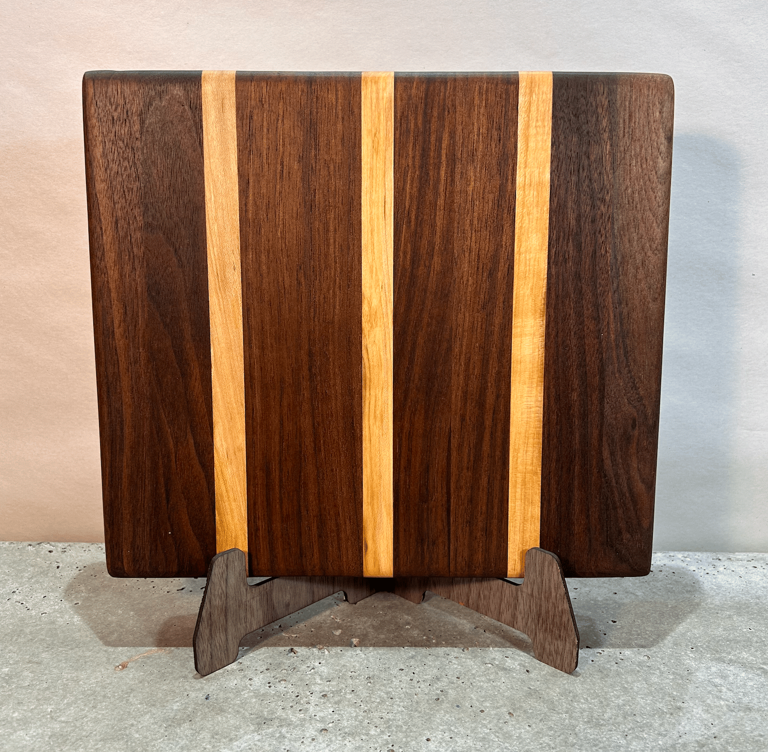 Elevate your kitchen prep with a piece of functional art. This handcrafted cutting board features rich, Dark Walnut paired with bold, light-grained stripes of the Maple. Whether you are using it for your daily use or as a centerpiece for your next charcuterie spread, this board is built to last a lifetime.