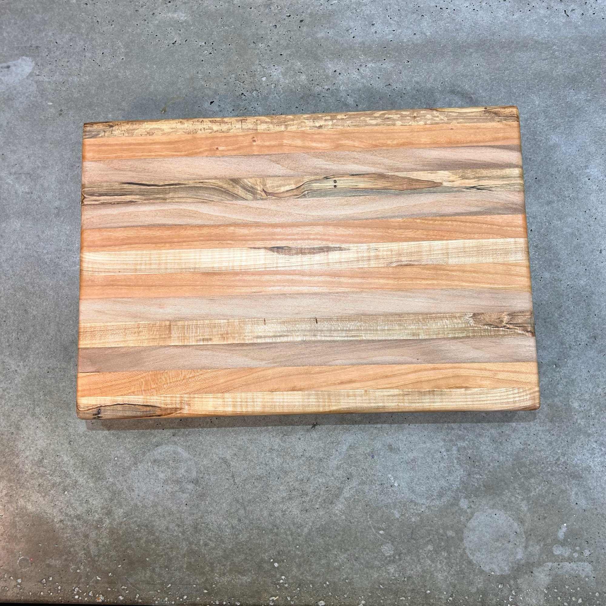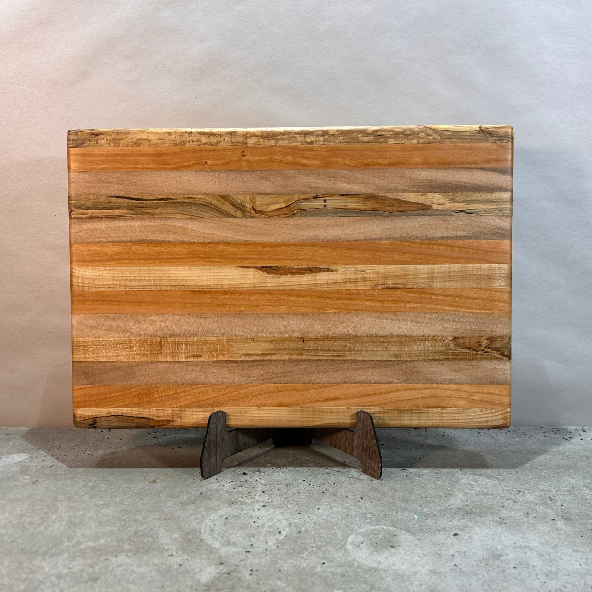 Elevate your kitchen prep with a piece of functional art. This beautifully crafted cutting board showcases stunningly contrasting light-grained stripes made from Maple, Spalted Maple, Cherry, and Sycamore. Whether you are using it for your daily use or as a centerpiece for your next charcuterie spread, this board is built to last a lifetime.