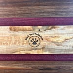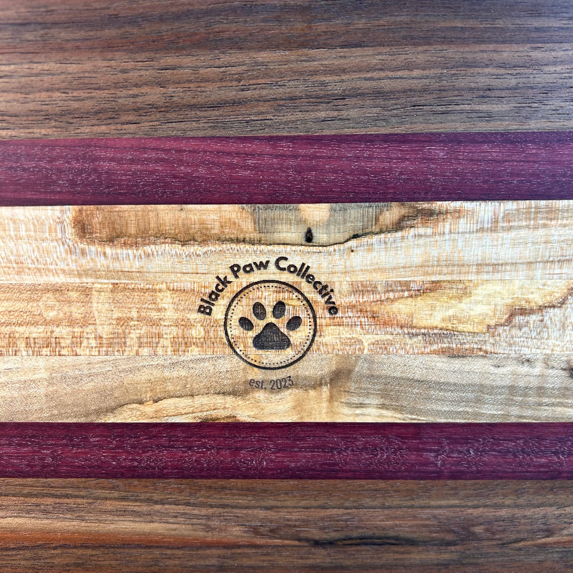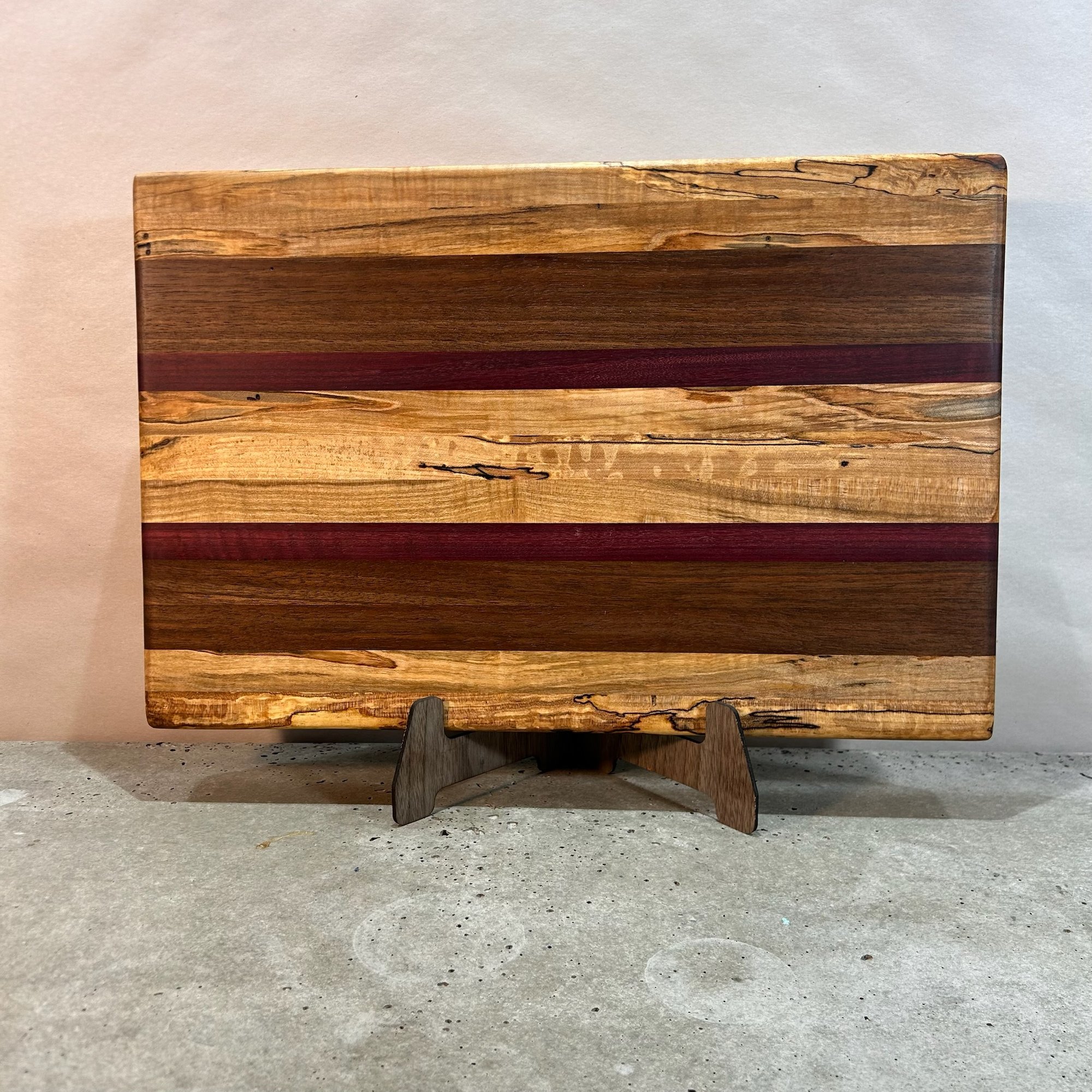 Elevate your kitchen prep with a piece of functional art. This beautifully crafted cutting board showcases deep, Dark Walnut complemented by striking, light-colored stripes of Spalted Maple, enhanced with accents of Purple Heart.. Whether you are using it for your daily use or as a centerpiece for your next charcuterie spread, this board is built to last a lifetime.