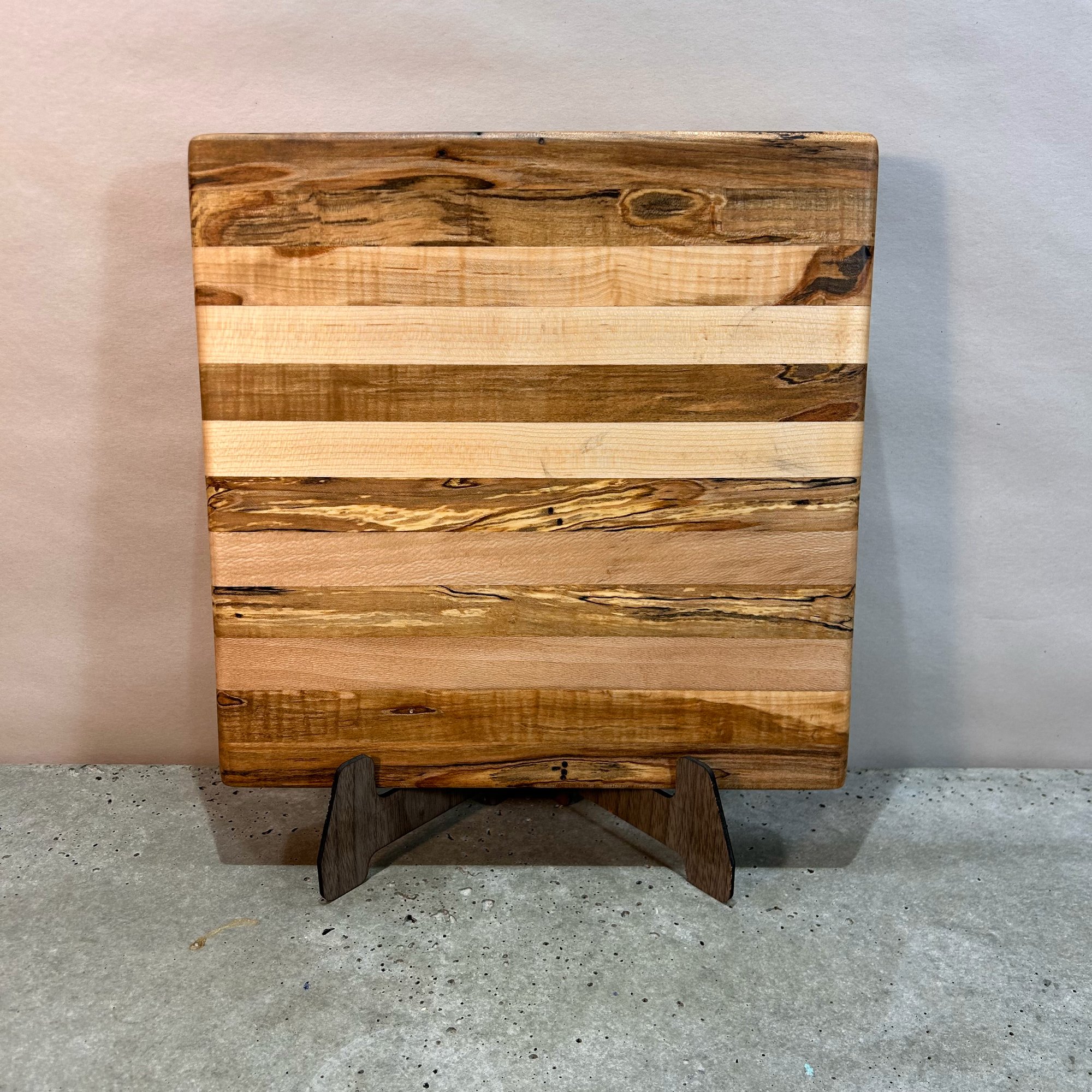 Elevate your kitchen prep with a piece of functional art. This handcrafted cutting board features distinctive and unique stripes of Maple, Spalted Maple, and Sycamore. Whether you are using it for your daily use or as a centerpiece for your next charcuterie spread, this board is built to last a lifetime.