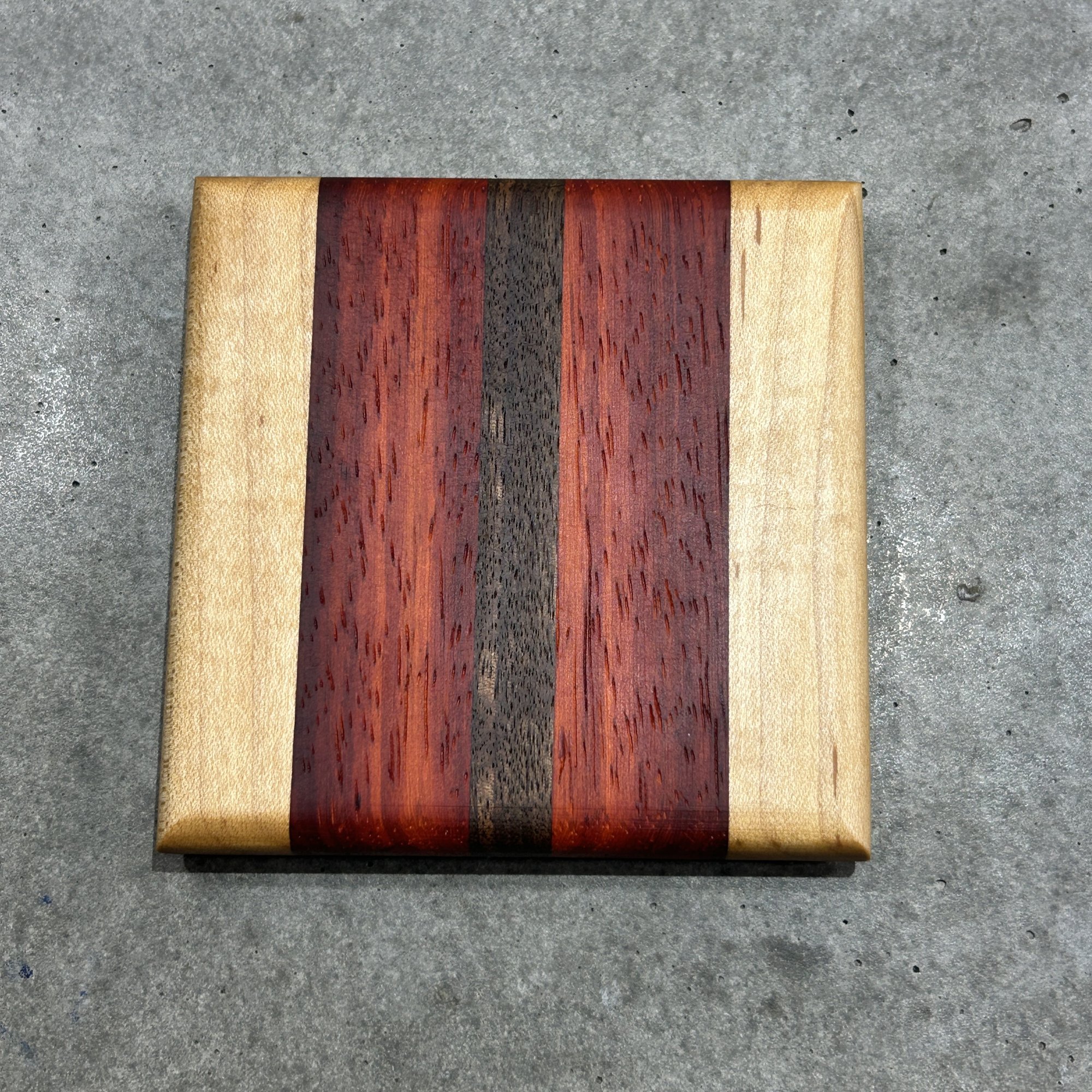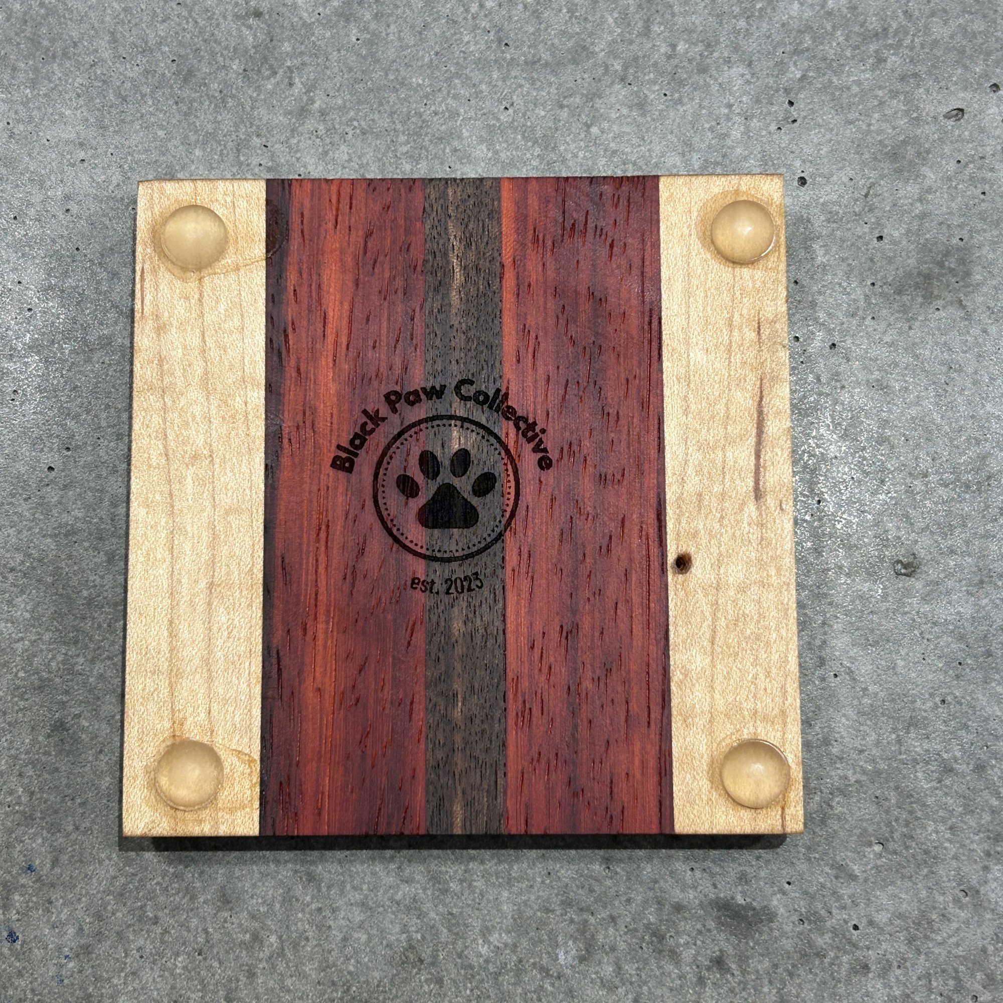 Materials: Maple, Padauk, and Dark Walnut with rubber feet